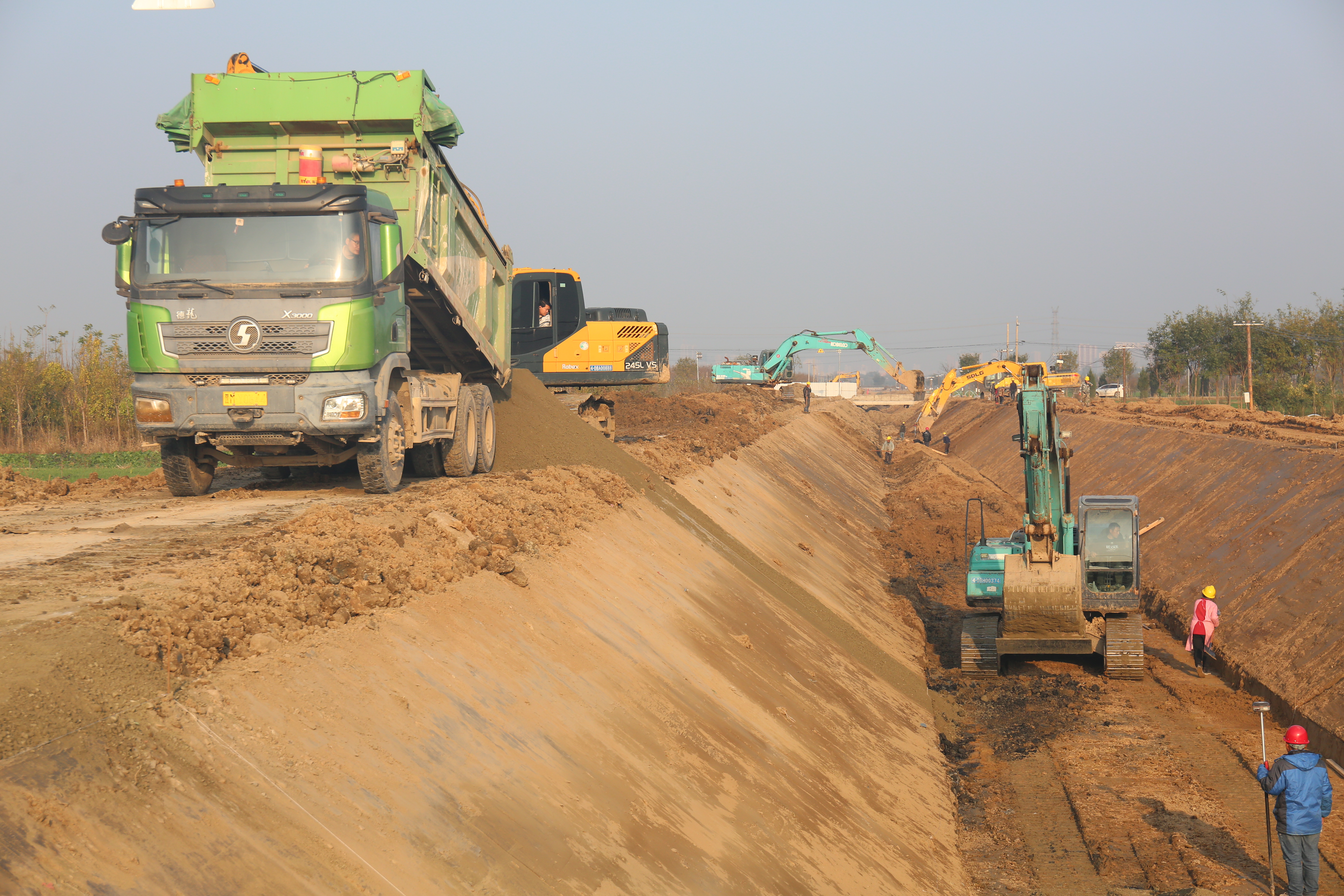 在項目施工現(xiàn)場,挖掘機、裝載機、振動碾、壓路機等多臺大型機械設(shè)備正全力運轉(zhuǎn),二十四小時作業(yè)不停工;十余名管理人員吃住在工地,隨叫隨到,發(fā)現(xiàn)問題及時解決問題,二十余名施工人員一身土一身泥,不叫苦不叫累,連續(xù)戰(zhàn)斗在工地;多個工作面同時展開施工,專人專崗,落實主體責任,各項工作井然有序,工程進度按照既定的工作目標穩(wěn)步進展。截止目前,已完成井點降水打井133眼,降水臺班2300個;清基28519m³、土方開挖9000m³、土方回填約6000m³、砂礫石墊層200m;渠道底板混凝土澆筑200m。